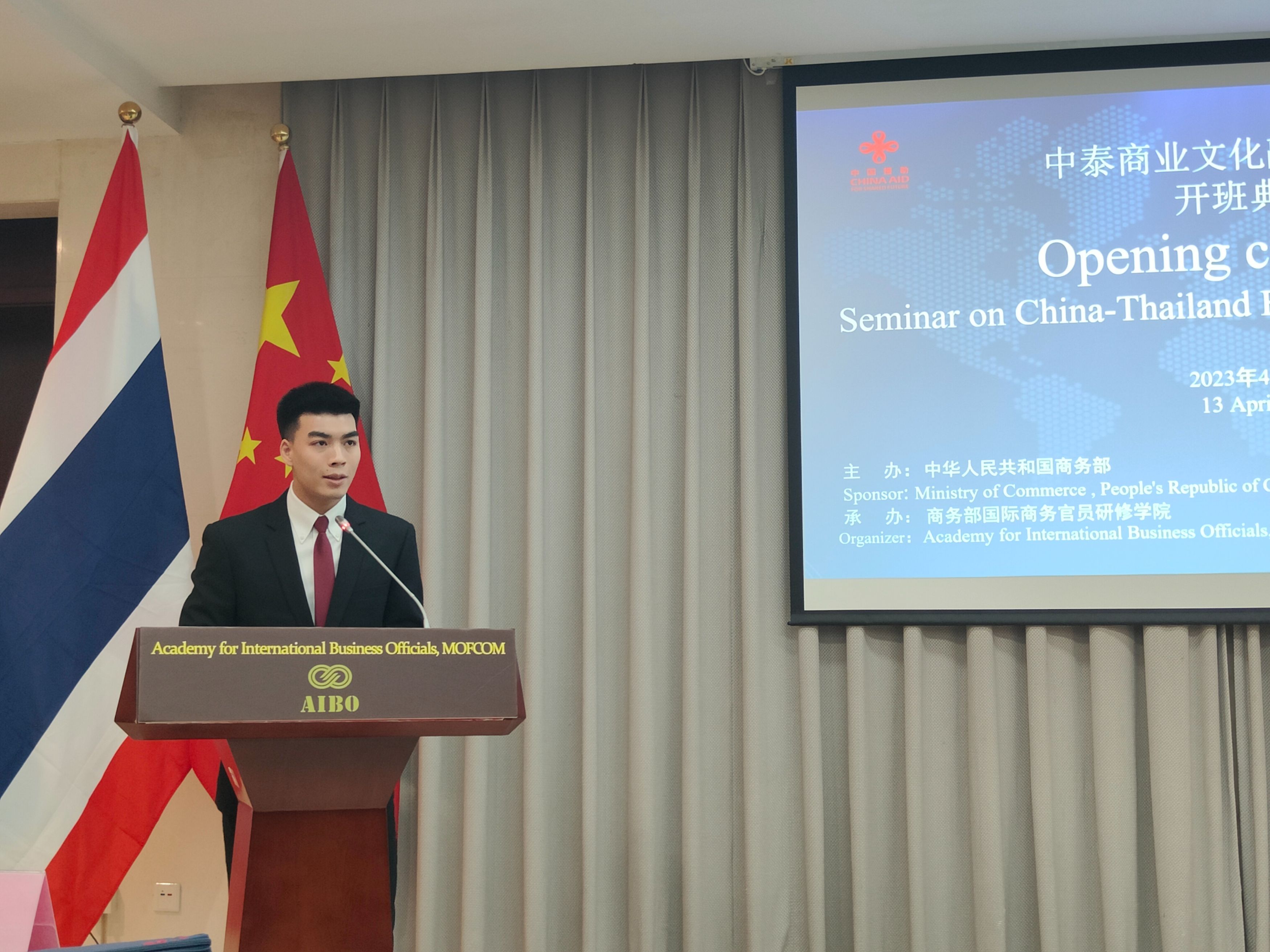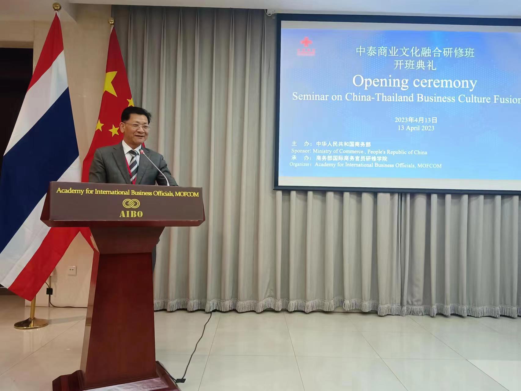 4月13日上午,由商务部主办、我院承办的中泰商业文化融合研修班在我院举行开班典礼。陈润云副院长出席并致辞,来自中国检验认证(集团)有限公司泰国分公司的胡权先生代表参训学员发言。
