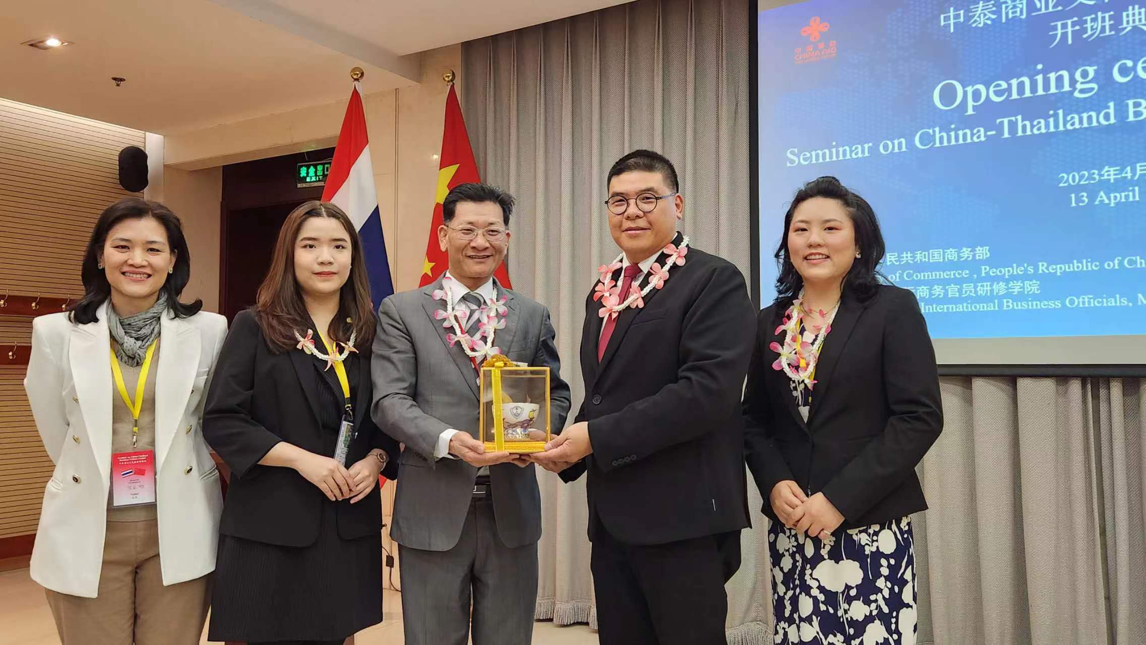 开班典礼当日恰逢泰国新年“宋干节”。陈润云副院长对来自泰国的24名参训学员表示热烈欢迎,并向全体学员致以诚挚的节日问候。陈润云副院长指出,泰国是中国重要的贸易伙伴,中泰高质量共建“一带一路”和高水平实施《区域全面经济伙伴关系协定》已取得丰硕成果。中泰友谊源远流长,文化纽带结实牢固。希望研修班学员积研有所获、学有所成,促进中泰商业文化在多领域融合。胡权先生代表研修班学员对中方的盛情邀请和细致安排表示感谢,表示将积极参与学习研讨和参观考察活动,把学习成果带回泰国,共同推动落实泰中商业贸易和文化交流领域的高质量可持续发展。
