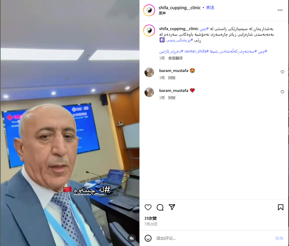 返回伊拉克不到两周,59岁的伊拉克针灸拔罐师巴拉姆·穆斯塔法·卡迪尔便已通过诊所社交媒体账号发布了七条图文视频,分享他参加商务部主办、北京华方科泰医药有限公司承办的“‘一带一路’国家中药在慢性病防治领域应用研修班”的宝贵经历。这位长期活跃在伊拉克荧幕上的资深医务工作者,已经成为名副其实的“中医推介大使”。图一:在海外社交媒体上分享研修经历在他分享的贴子里,既有抓药、中药贴敷等中医技术的直观呈现,也...