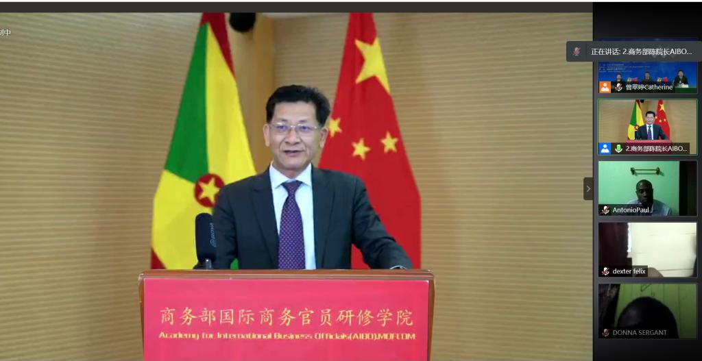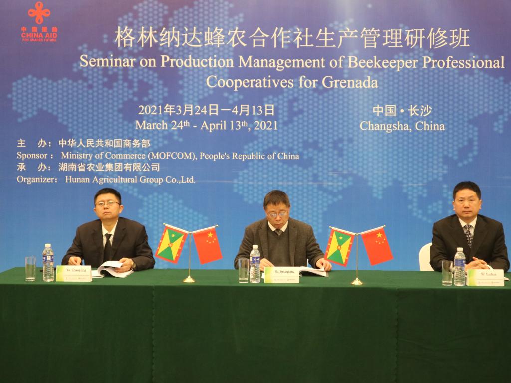 On March 24, 2021, Mr. Chen Runyun,Vice President of the Academy for International Business Officials (AIBO), attended the online opening ceremony of Seminar on Production Management of Beekeeper Professional Cooperatives for Grenada and delivered a speech. Rhonda Jones and Elvis Morain from Grenada also made remarks on the opening ceremony.