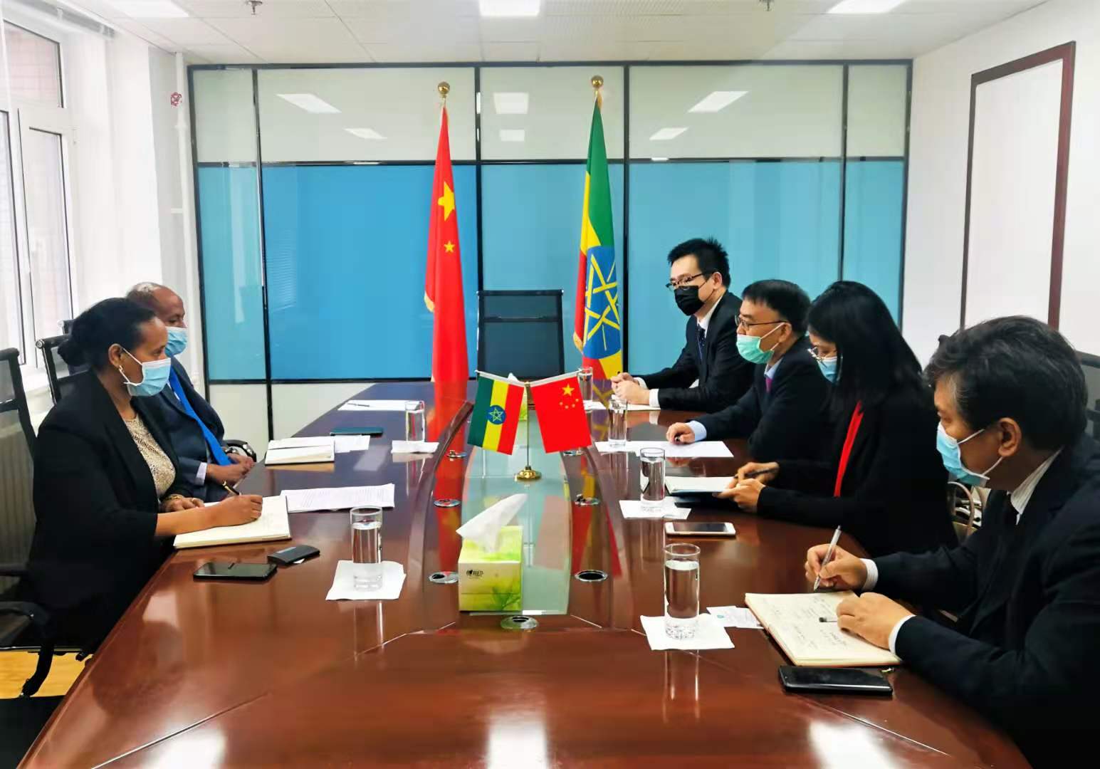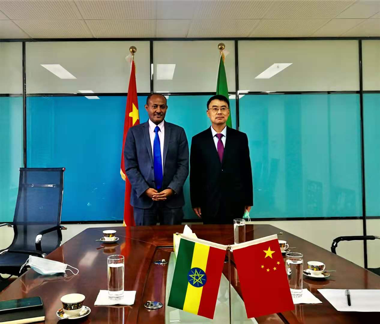 On the afternoon of August 27, 2020, Vice President Lei Hao of the Academy for International Business Officials (AIBO) paid a visit to the Embassy of the Federal Democratic Republic of Ethiopia in China, and met with Minister Ephrem Bouzayhue and Counsellor Rekach Haregewoin. Both sides held friendly talks on human resources development and cooperation, and exchanged views on establishing closer communication and cooperation mechanism in that regard.