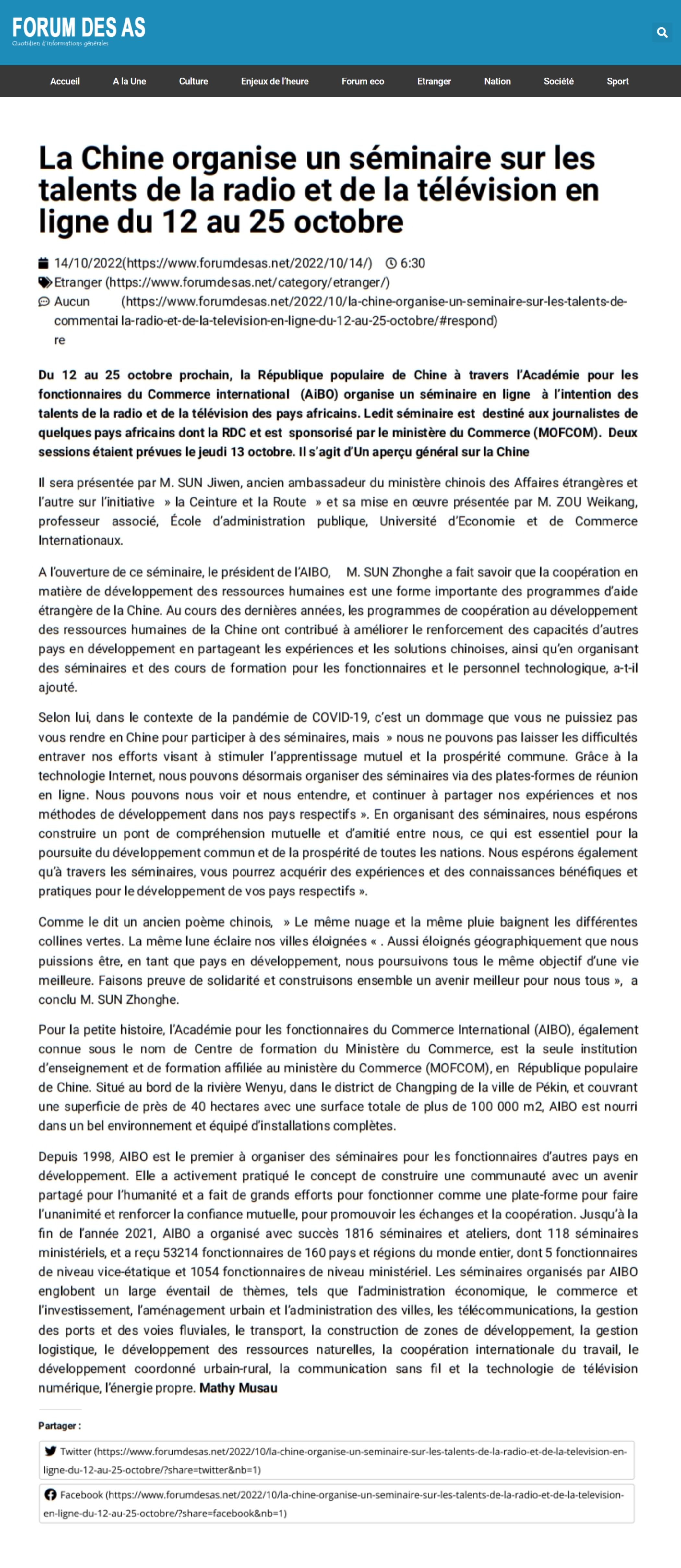 Report Published on Forum des AS: “La Chine organise un séminaire sur les talents de la radio et de la télévision en ligne du 12 au 25 octobre”