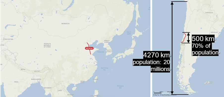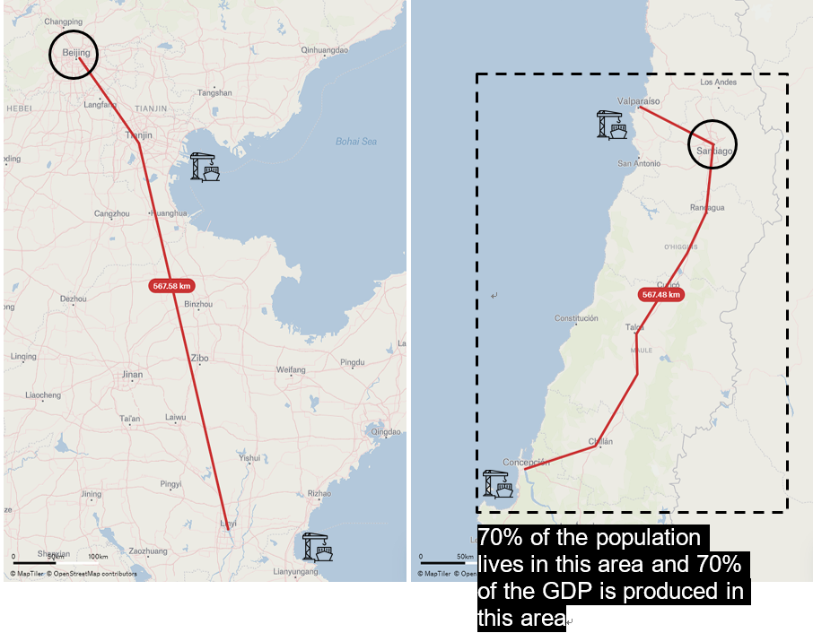 Chile is a long and narrow country, located at the end of the world. It has a length of 4,270 km, but its average width is only 200 km. Despite this, approximately 70% of the population is concentrated in the central area of the country, where the three main cities are located: Valparaíso, Santiago, and Concepción. These cities are separated by a distance of approximately 500 km, similar to the distance between Beijing and Linyi in China.