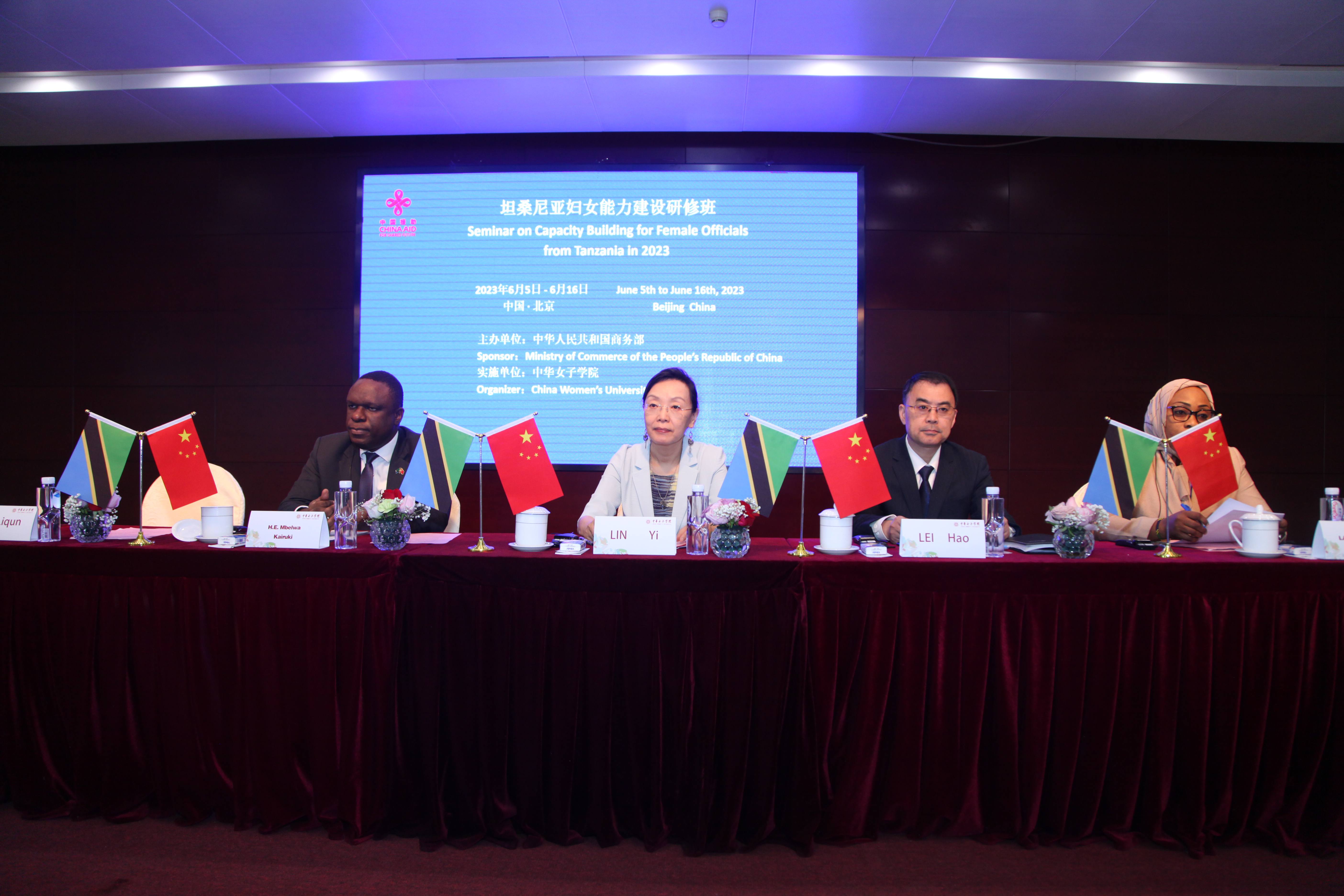 6月5日上午,由商务部主办、中华女子学院(以下简称“女子学院”)承办的“坦桑尼亚妇女能力建设研修班”举行开班仪式。坦桑尼亚驻华大使姆贝尔瓦﹒凯鲁基、全国妇联副主席林怡、中国驻坦桑尼亚大使陈明健(在线)、我院雷浩副院长出席并致辞。坦桑尼亚革命党中央委员莱拉·布伦·恩戈齐作为学员代表发言。开班仪式由中华女子学院刘利群院长主持。