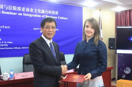 由商务部主办、我院承办的“2016年中国与拉脱维亚商业文化融合研修班”于4月26日上午在我院举行了结业典礼,我院刘明哲副院长、拉脱维亚投资发展署高级顾问莱尔德·科恩女士出席典礼并分别致辞。
