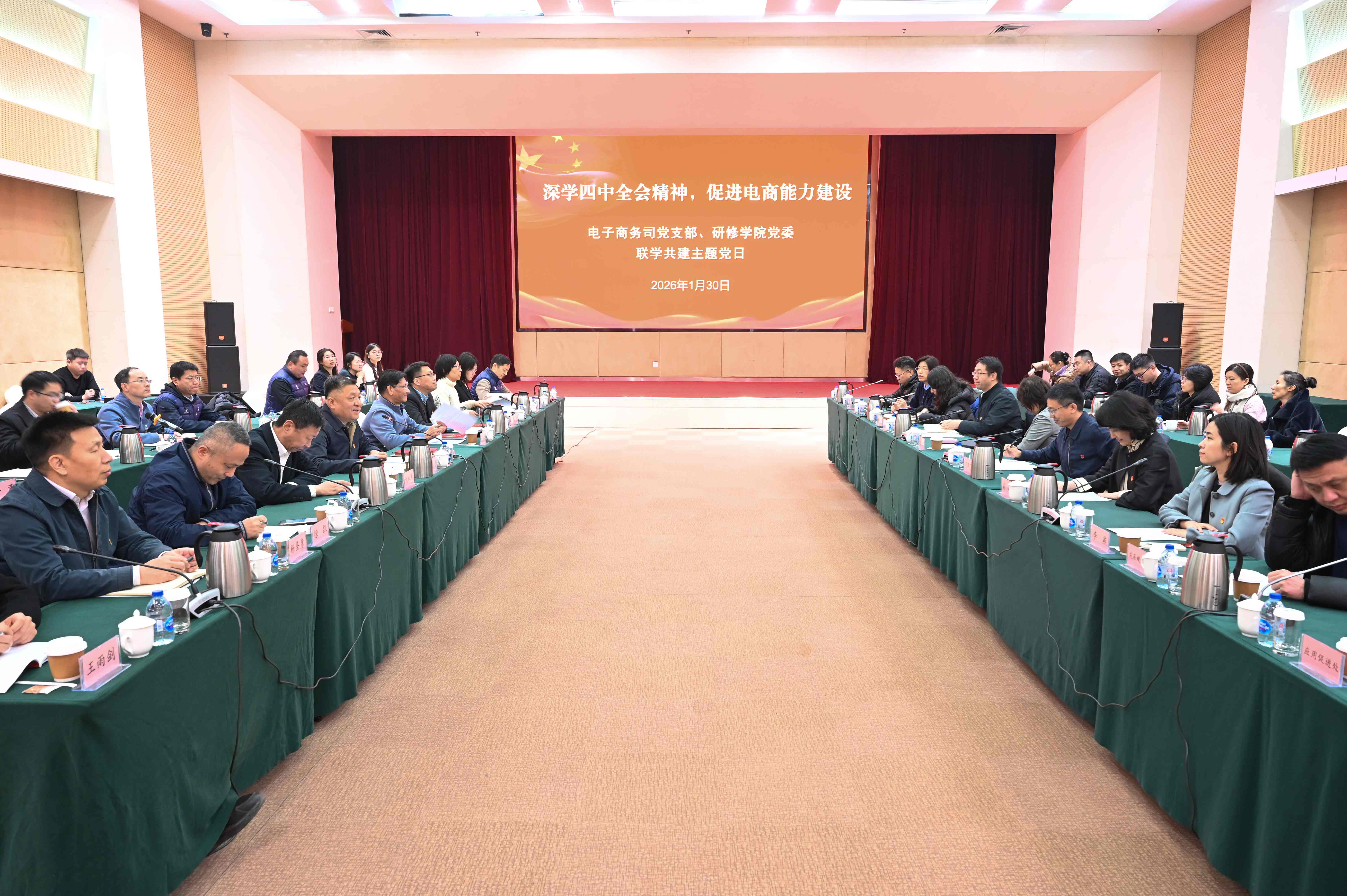 1月30日,研修学院党委与部电子商务司党支部在我院共同开展“深学四中全会精神,促进电商能力建设”主题党日。院长兼党委书记吴彬,院领导陈润云、刘如涛、郑乐、徐凯,电子商务司党支部副书记、副司长王鹏飞,二级巡视员(副司级)黄玲,二级巡视员申屠晓琦,以及双方近50名党员代表参加此次活动。