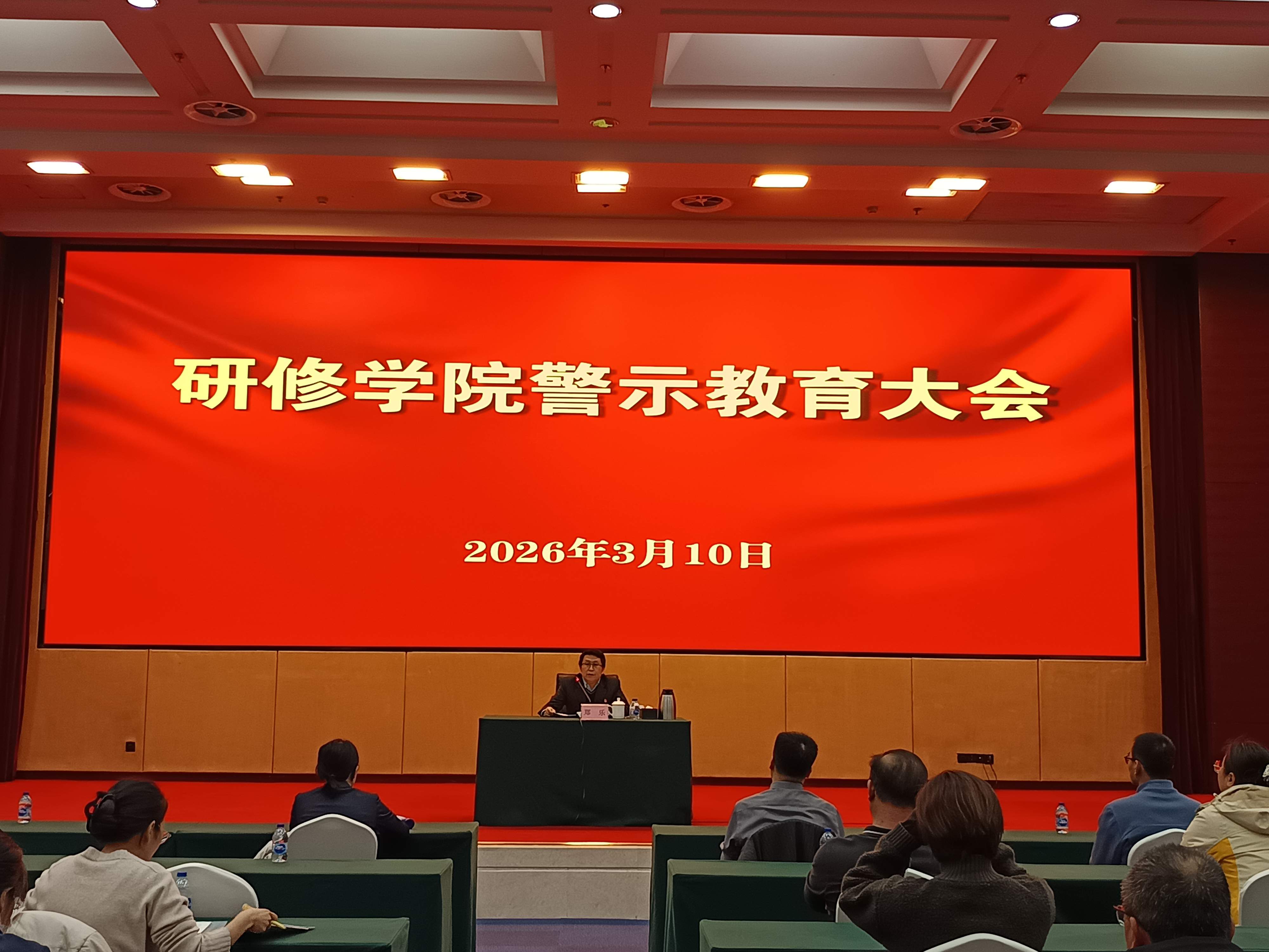 2026年3月10日上午,研修学院召开警示教育大会,党委副书记兼纪委书记郑乐同志传达了部党风廉政建设和反腐败工作会议暨警示教育大会精神,通报了相关典型案例。学院党员干部职工近90人参会。