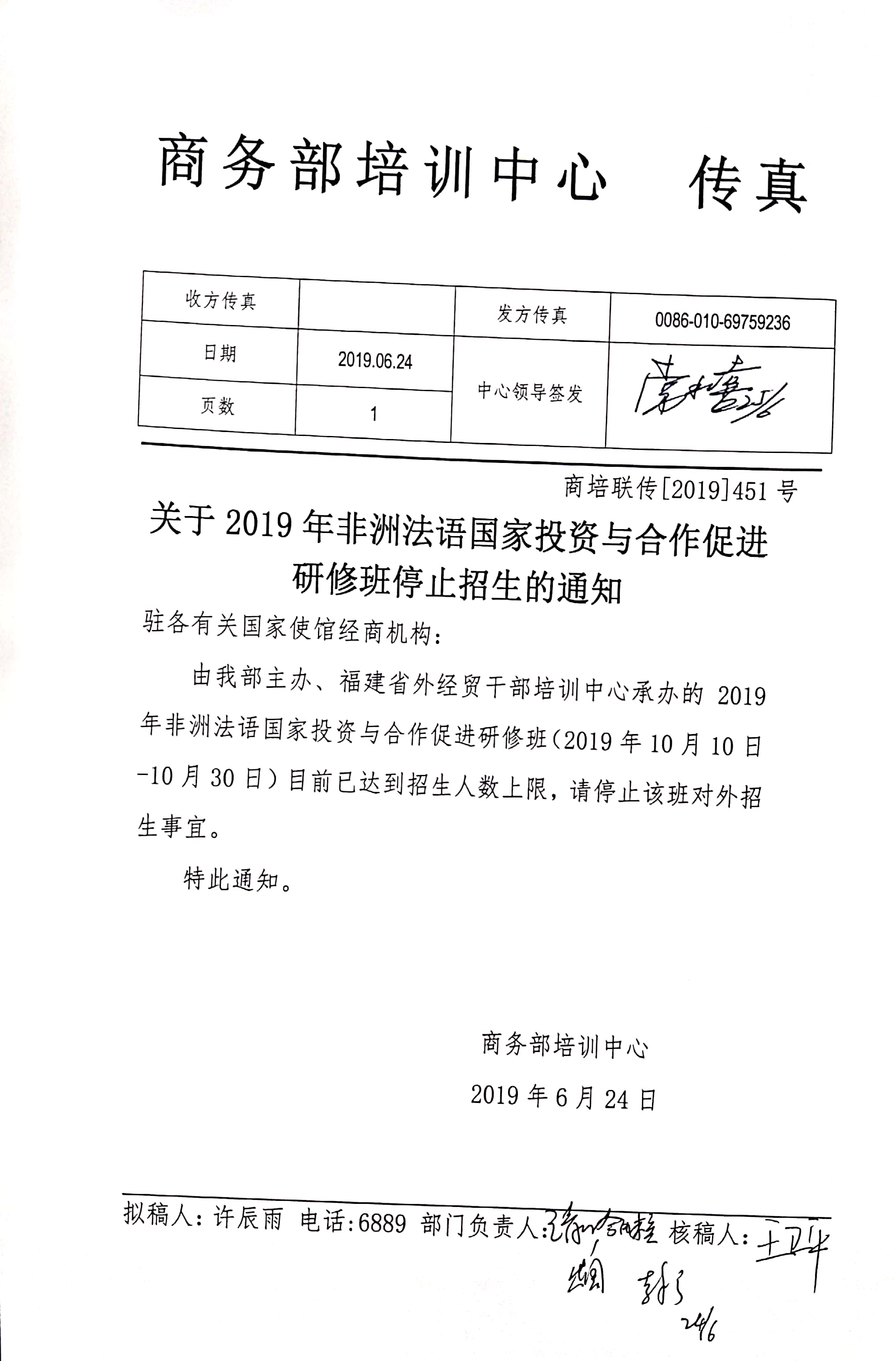 关于2019年非洲法语国家投资与合作促进研修班的停招通知