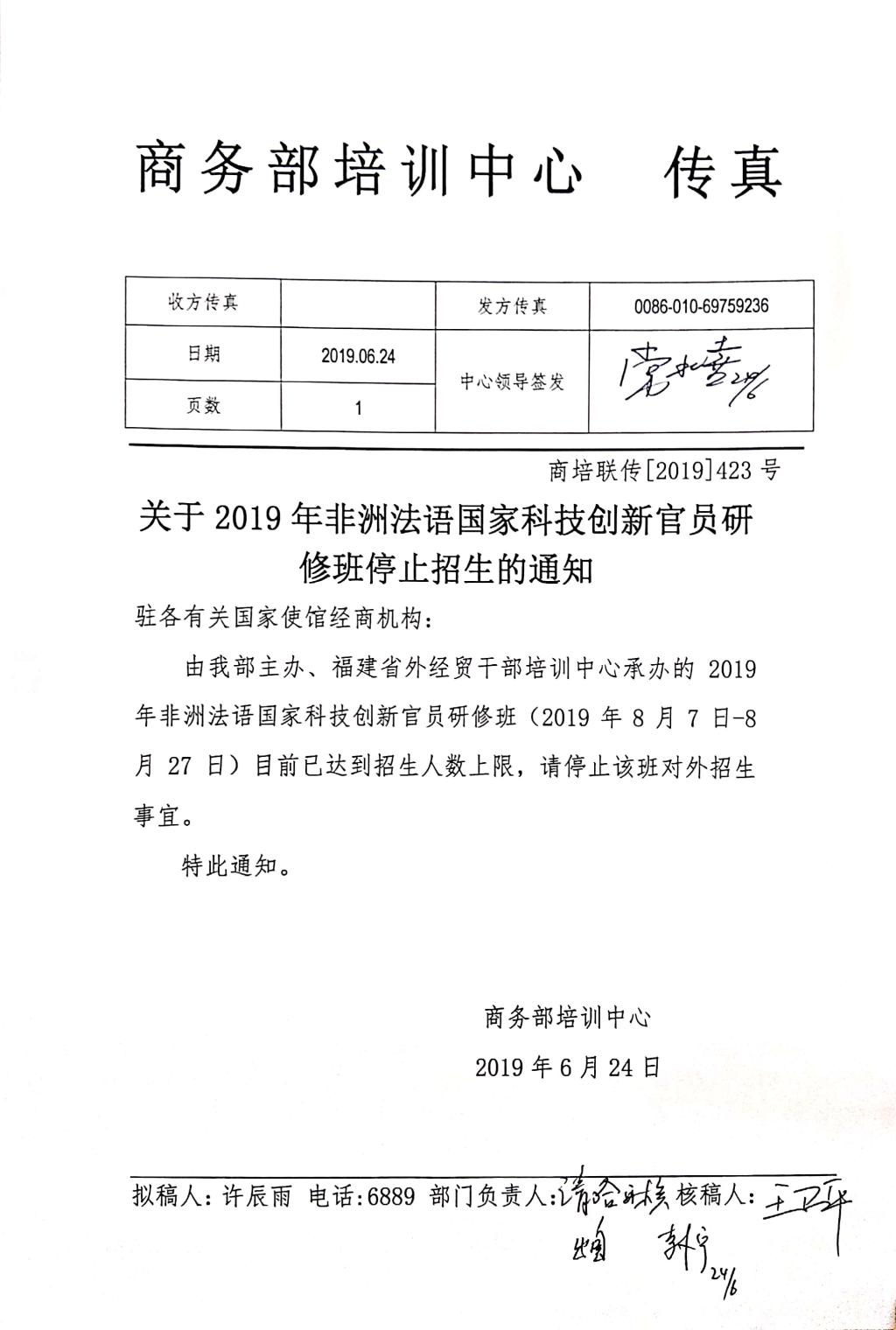 关于2019年非洲法语国家科技创新官员研修班的停招通知