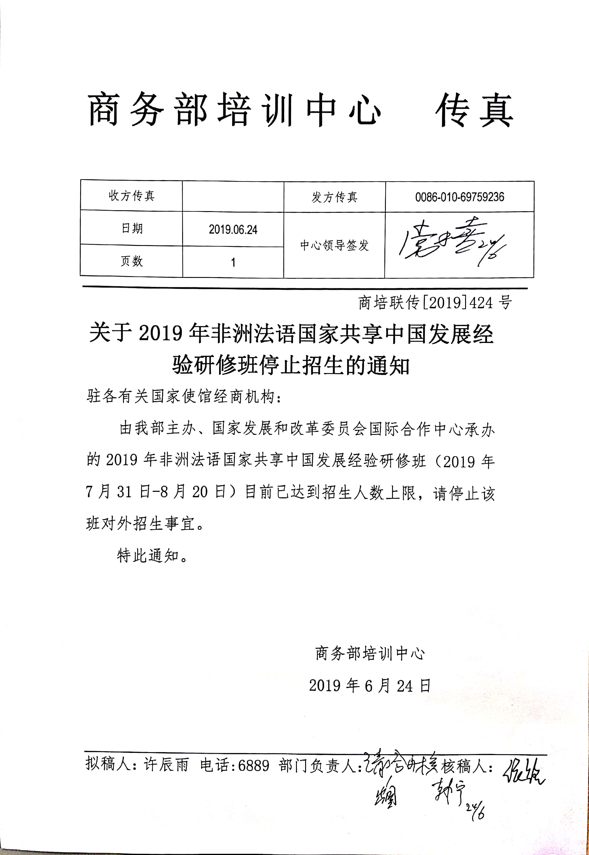 关于2019年非洲法语国家共享中国发展经验研修班的停招通知