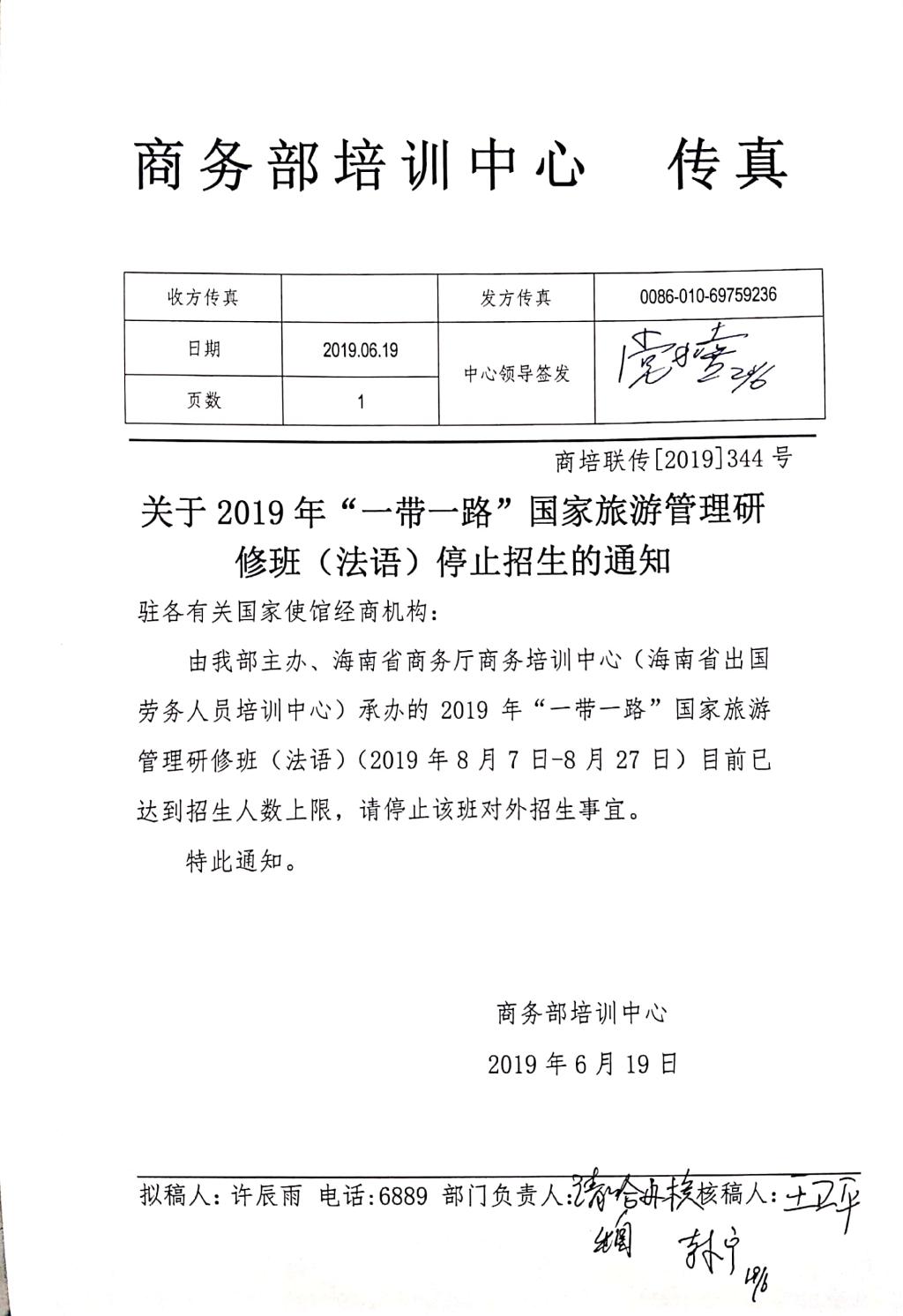 关于2019年“一带一路”国家旅游管理研修班(法语)的停招通知