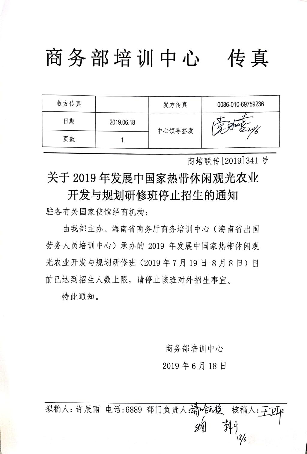 关于2019年发展中国家热带休闲观光农业开发与规划研修班的停招通知