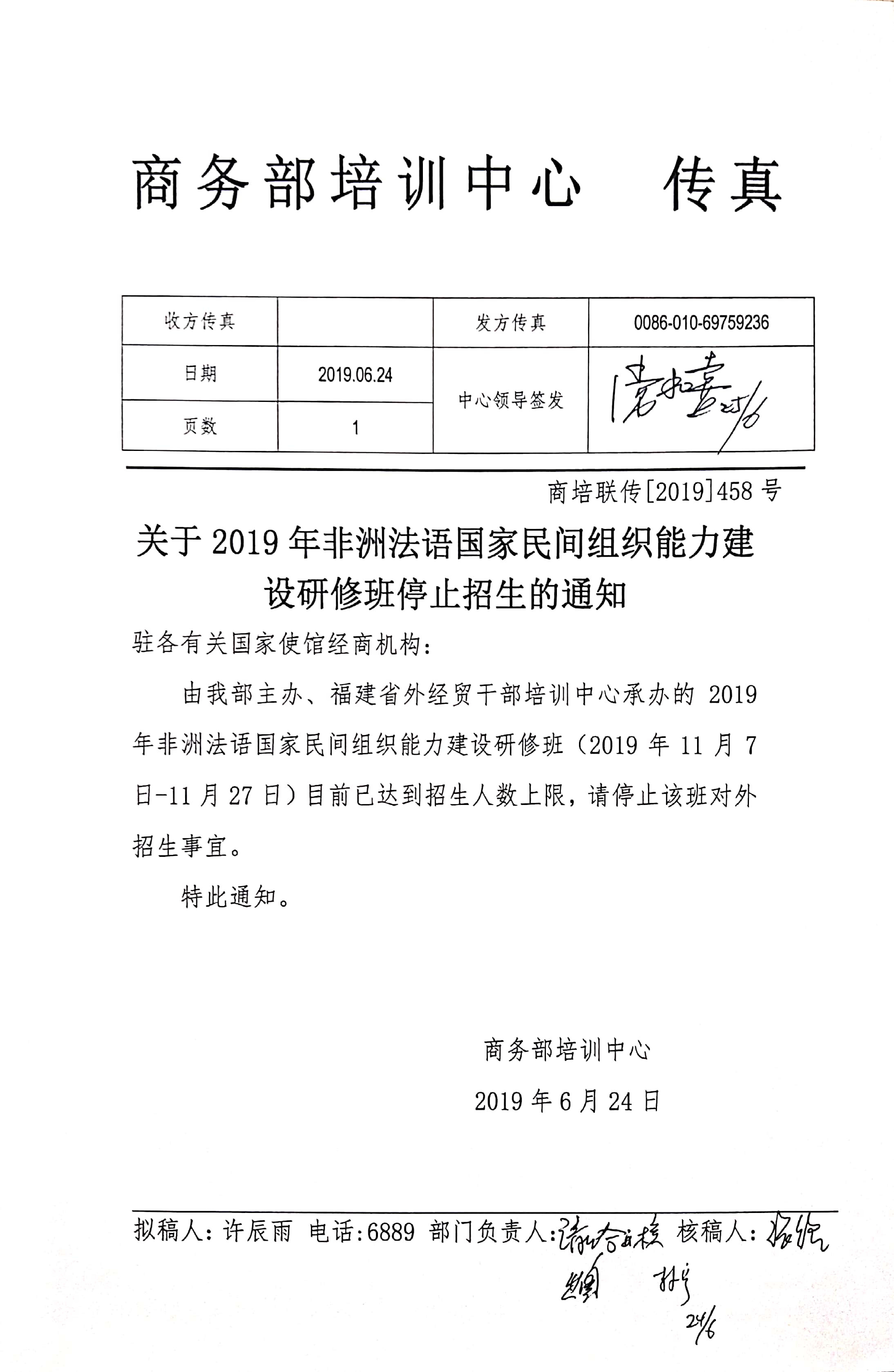关于2019年非洲法语国家民间组织能力建设研修班的停招通知
