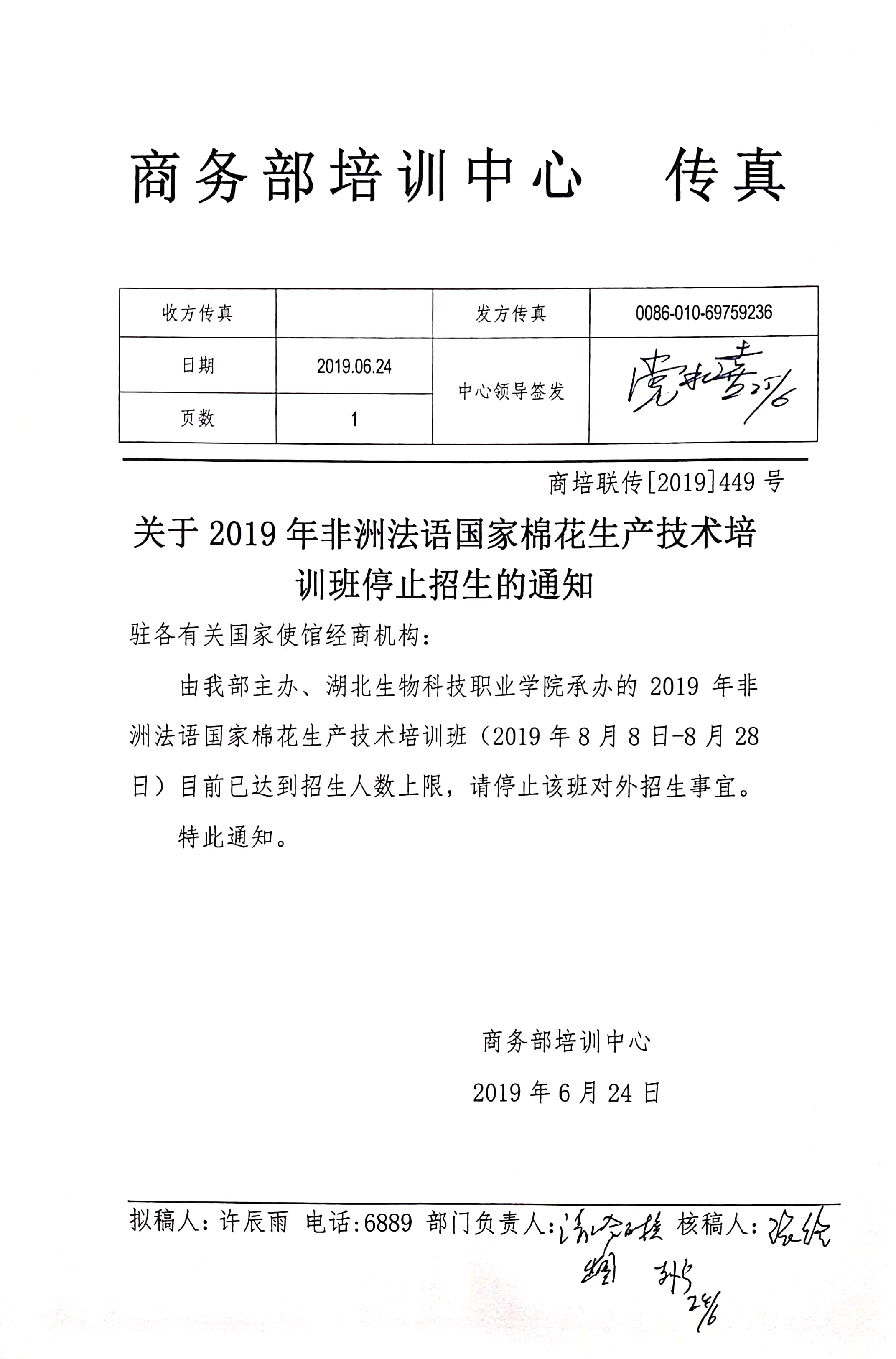 关于2019年非洲法语国家棉花生产技术培训班的停招通知