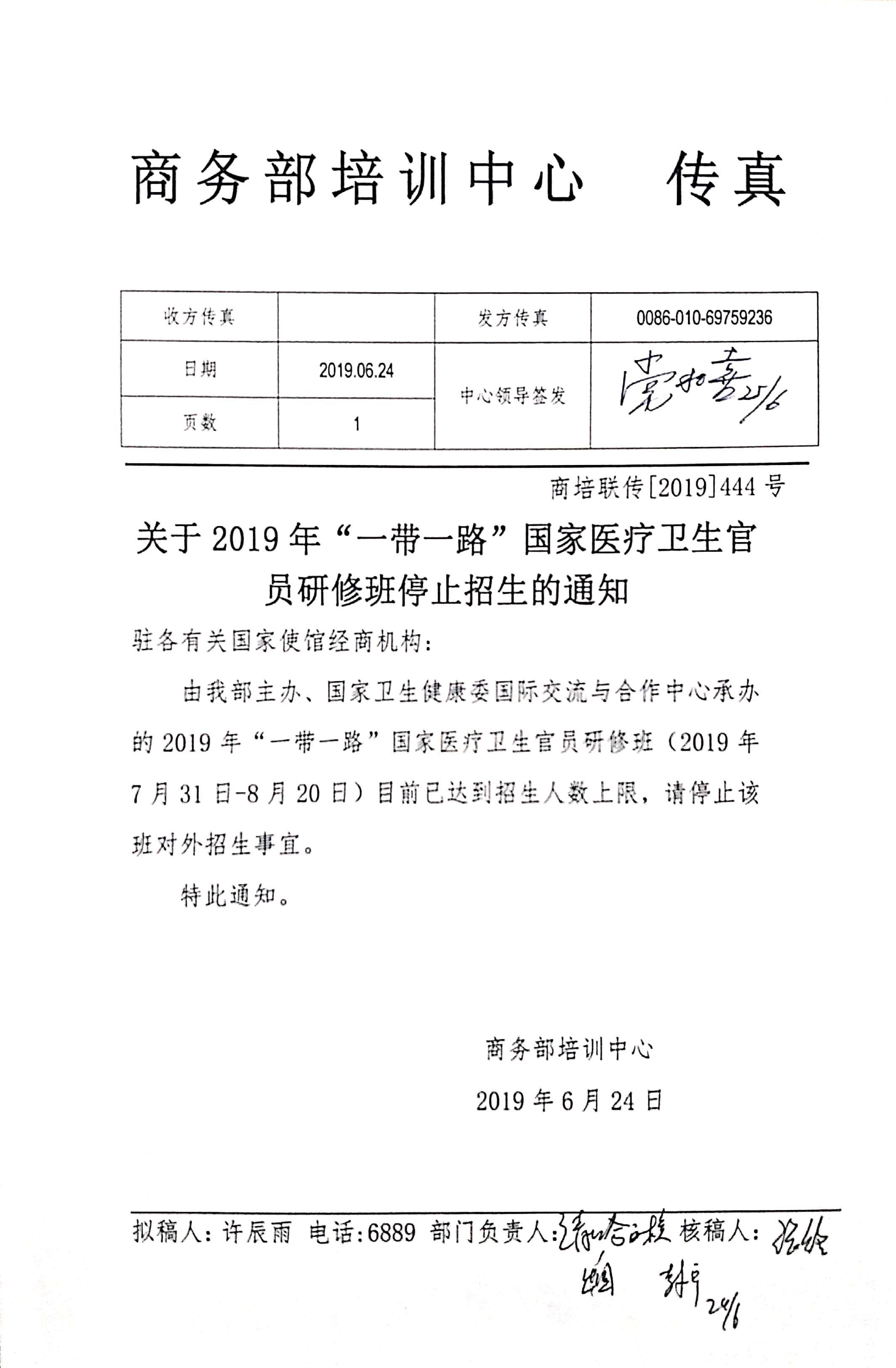 关于2019年“一带一路”国家医疗卫生官员研修班的停招通知