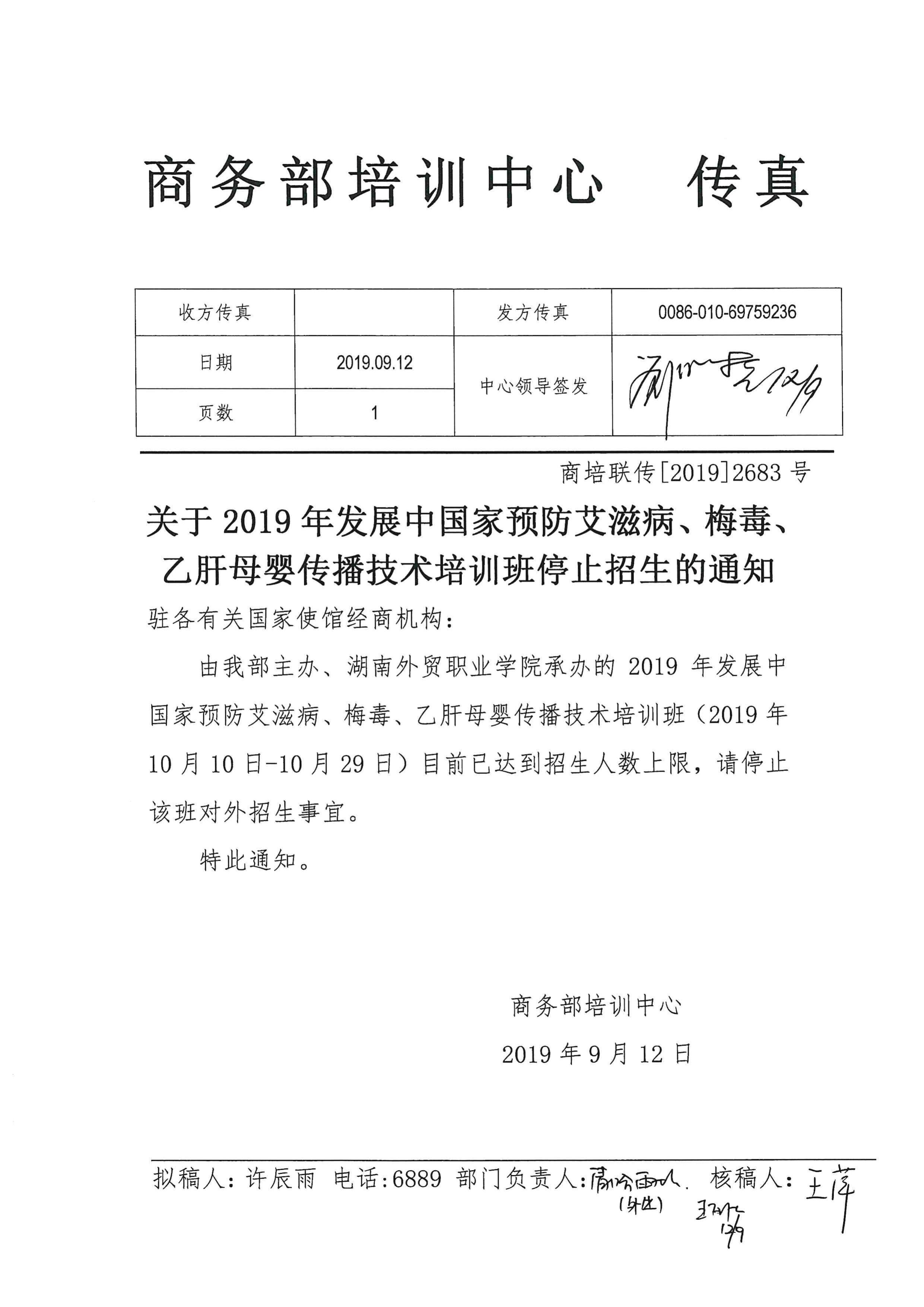 关于2019年发展中国家预防艾滋病、梅毒、乙肝母婴传播技术培训班的停招通知