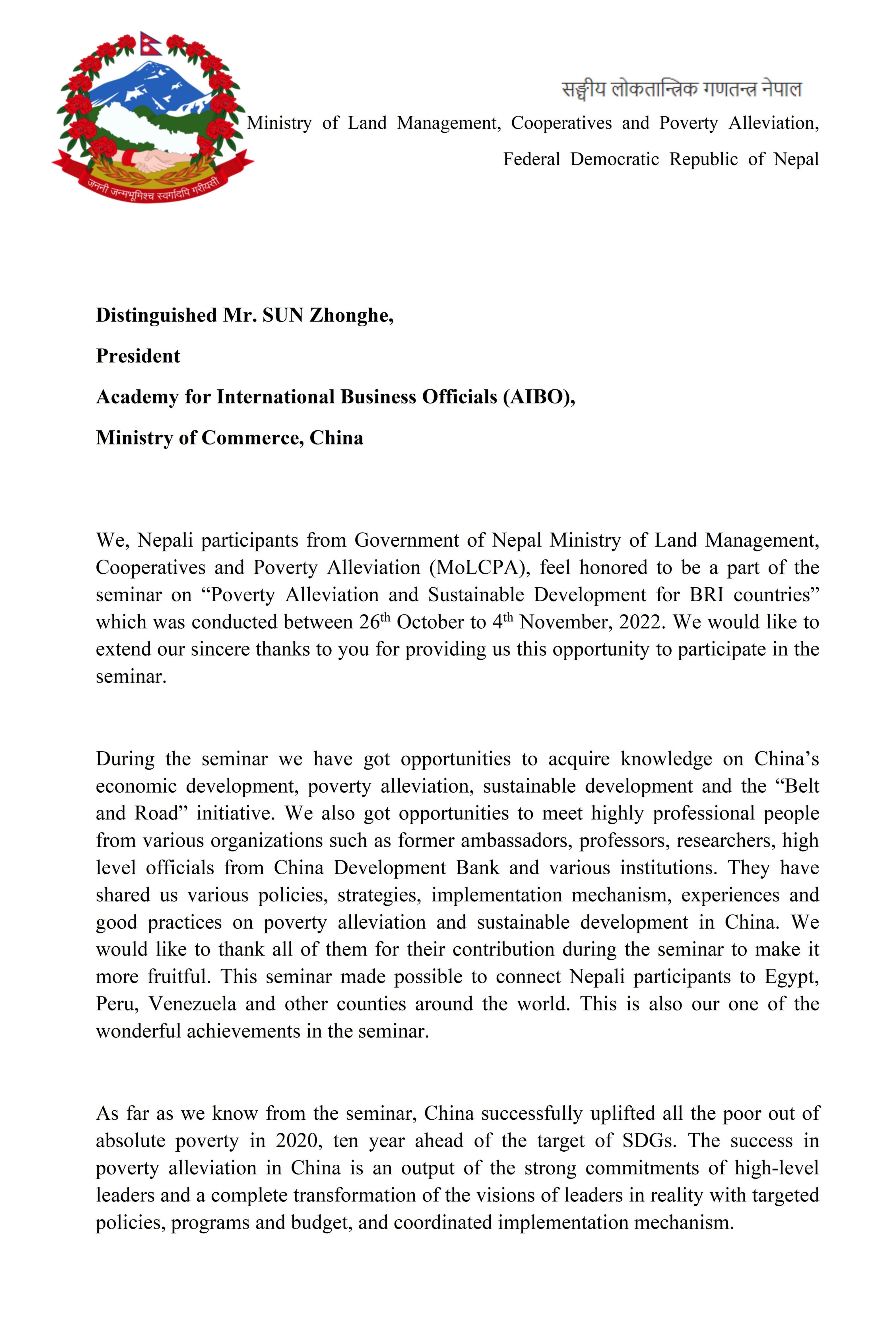 我们来自尼泊尔政府土地管理、合作和减贫部,很荣幸在2022年10月26日至11月4日参加了由商务部国际商务官员研修学院举办的“一带一路”国家减贫和可持续发展研修班。在此,我们想对贵院举办本期研修班并邀请我们参加表示衷心的感谢。