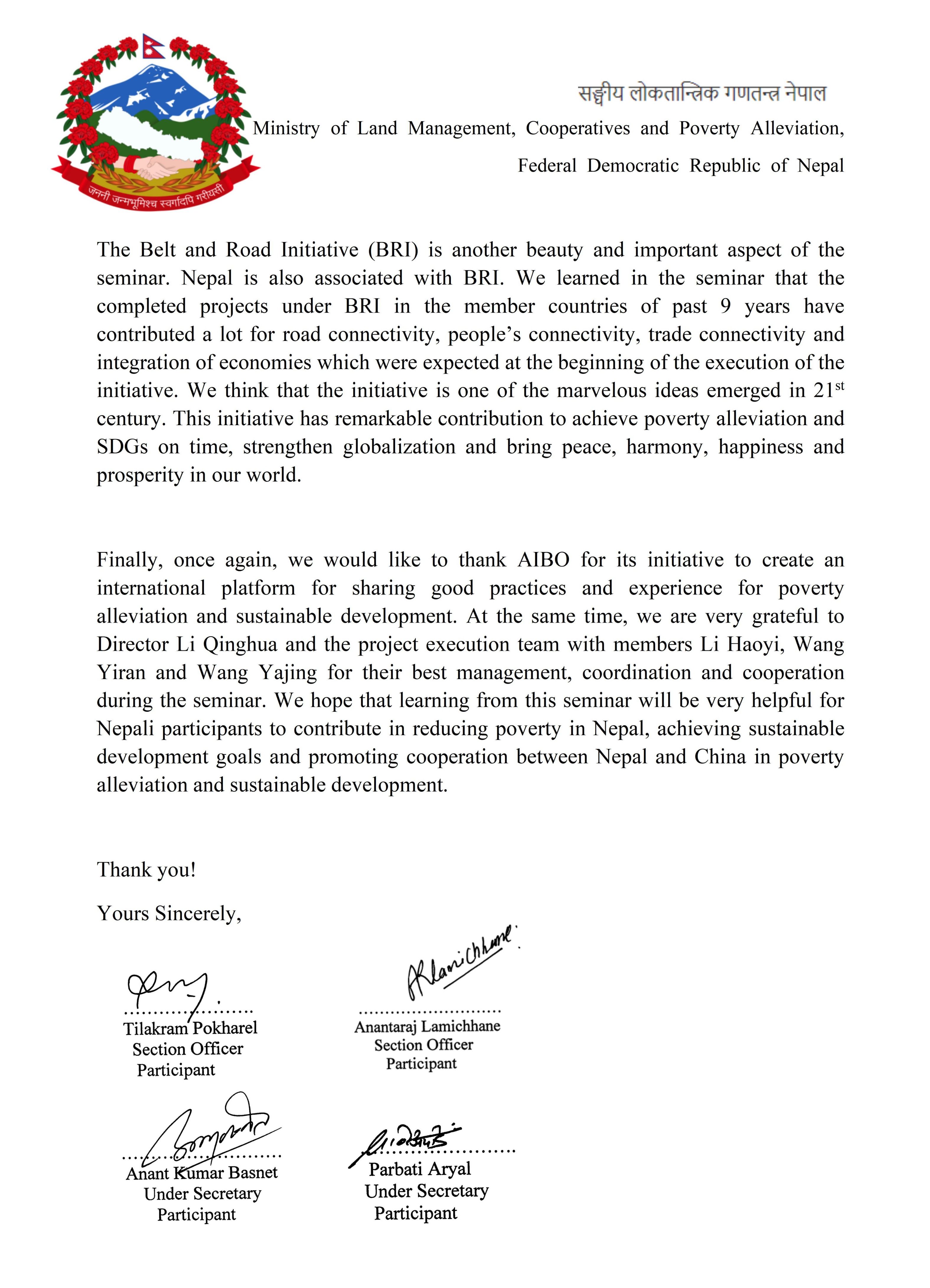 最后,我们想再次感谢商务部国际商务官员研修学院搭建国际交流平台,为我们分享减贫和可持续发展良好做法和经验。同时,我们也想对学院领导、项目执行团队成员李昊一、王一然和王雅静表示感谢,中方团队在研修班期间做了出色的管理、协调工作。我们相信,本期研修班将会对我国完成减贫、实现可持续发展目标大有帮助,并同时促进尼泊尔与中国在减贫和可持续发展方面的合作。