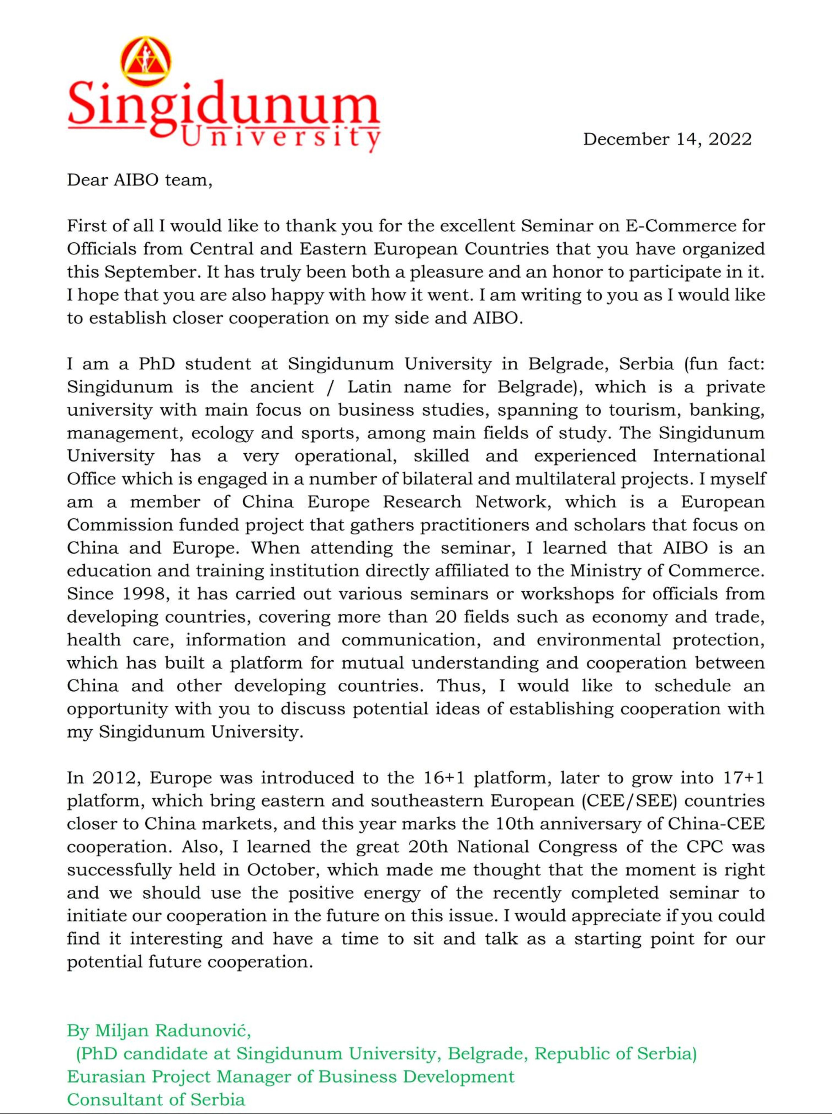 感谢贵院在今年9月成功举办“中东欧国家电子商务研修班”,研修班取得积极成果,我对能参与其中深感愉悦和荣幸。我此番来信,希向贵院表达建立更密切合作的愿望。