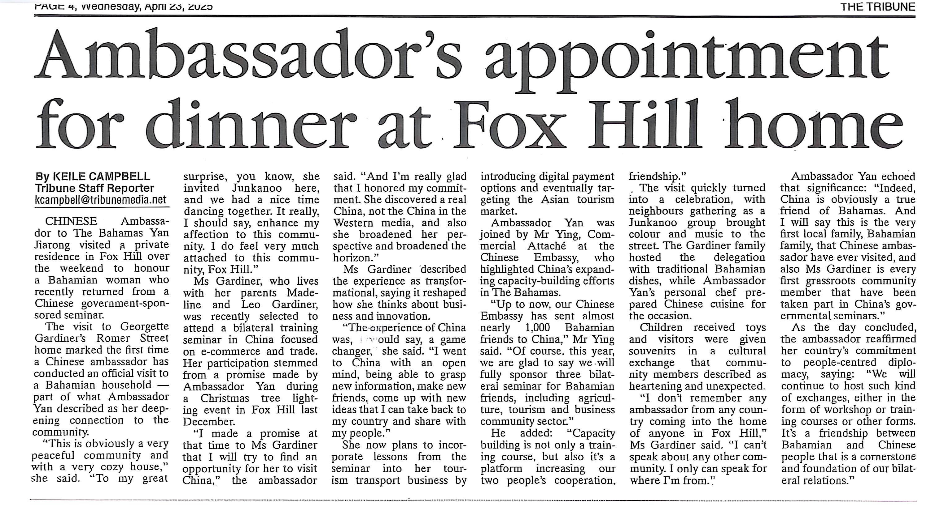 再次听到乔治亚特的消息,她正在以另一种方式靠近中国。4月18日对她而言是一个特殊的日子,中国驻巴哈马大使严家蓉来到家中做客,乔治亚特及其家人顿时成为社区焦点,全家人共同见证了首位中国使节访问巴哈马社区民众这一历史时刻。