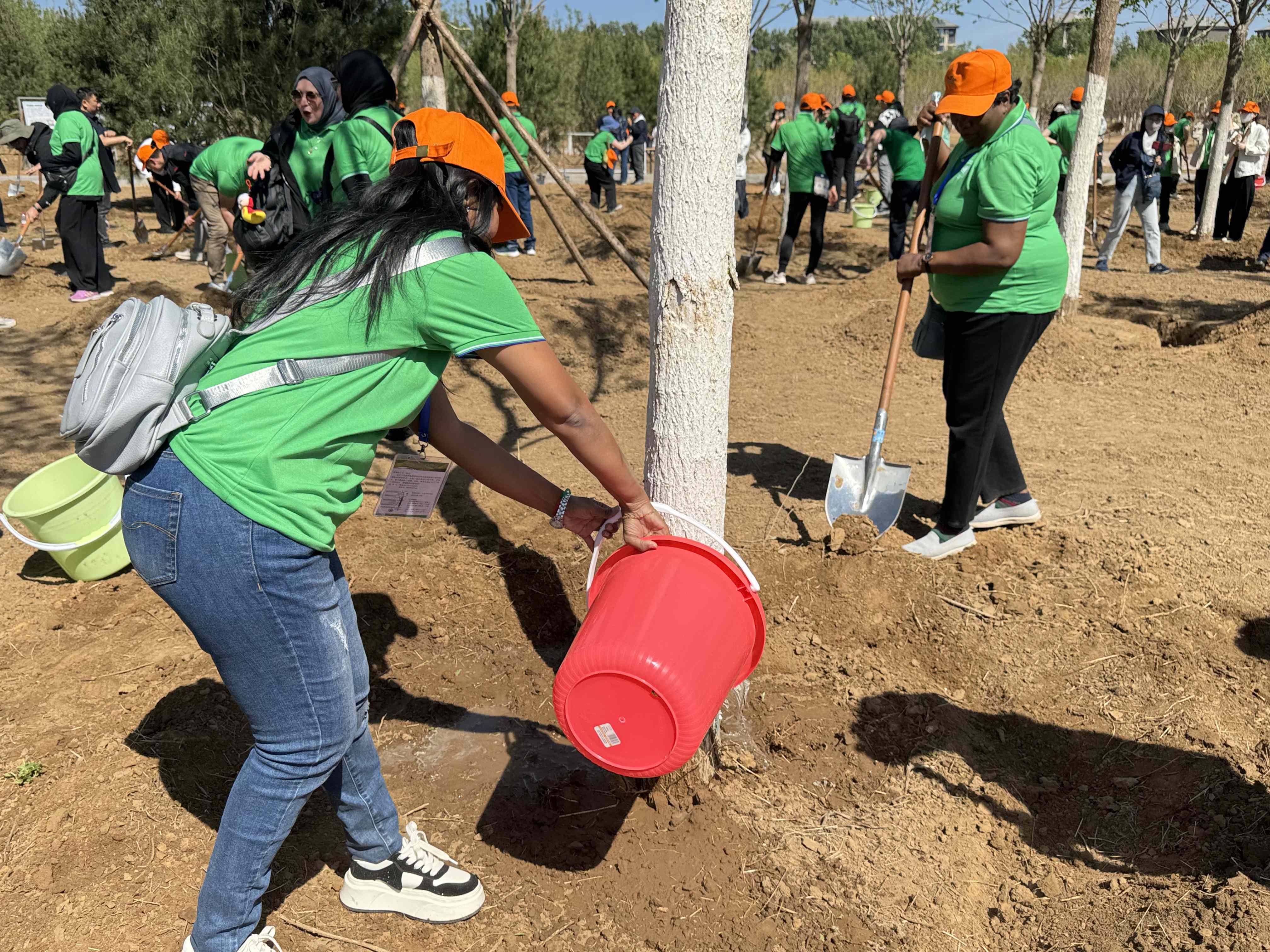 铲土造坑、培土围堰、提水浇灌……在世界环境日到来之际,在北京市丰台区怪村郊野公园内,一群中外青年热火朝天地忙碌着,他们种下白皮松、油松、白蜡、元宝枫、海棠等苗木,一片象征友谊与希望的“友谊林”生机盎然。