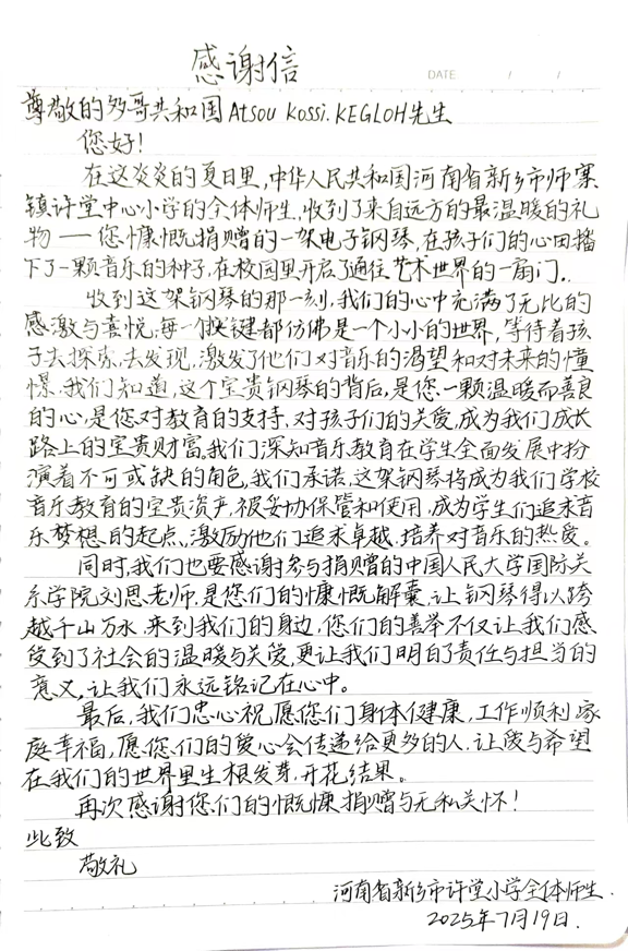 这份心意,在临行前夕化作了具体行动。凯格洛先生精心选购了一架崭新的电子琴,并郑重委托给中国人民大学,希望能将这份承载着多哥人民情谊的礼物,转赠给中国乡村的孩子们。人大的领导、老师深受感动并高度重视,恰好学校学生王冶璇同学即将作为志愿者,前往河南省新乡市许堂小学进行支教。于是,这架寄托着深情厚谊的电子琴,便由王冶璇同学带往了千里之外的乡村校园。